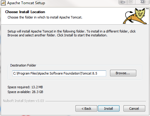 7.选择安装目录,点击Install按钮即可完成安装。由于Tomcat8.0能自动完成环境变量的配置,所以我们就无需再配置了,安装好之后就可以直接使用了