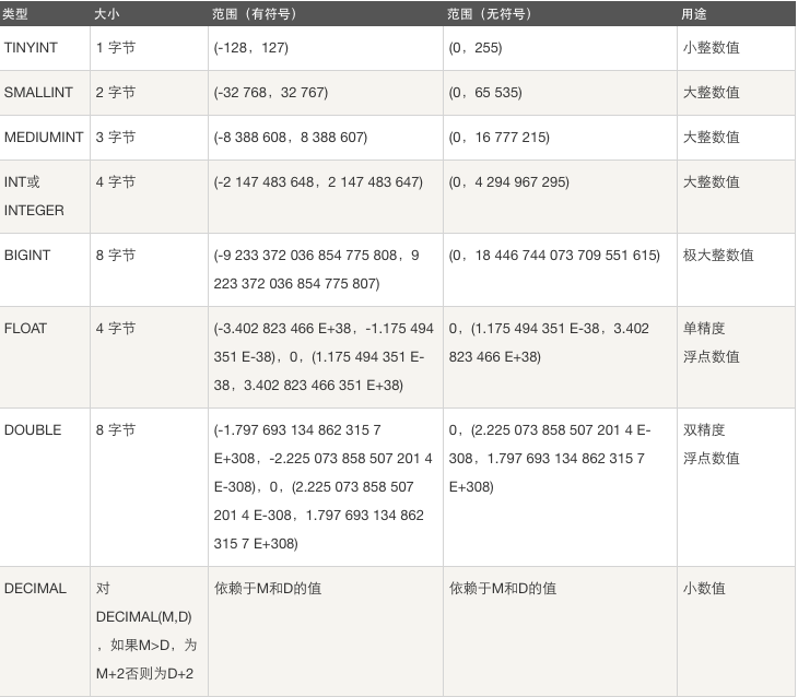 大整数,数据类型用于保存一些范围的整数数值范围: