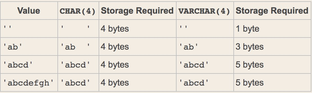 mysql> create table t1(x char(5),y varchar(5));