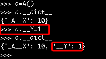 # 其实这仅仅这是一种变形操作 # 类中所有双下划线开头的名称如__x都会自动变形成:_类名__x的形式: class A: __N=0 #类的数据属性就应该是共享的,但是语法上是可以把类的数据属性设置成私有的如__N,会变形为_A__N def __init__(self): self.__X=10 #变形为self._A__X def __foo(self): #变形为_A__foo print('from A') def bar(self): self.__foo() #只有在类内部才可以通过__foo的形式访问到. # A._A__N是可以访问到的,即这种操作并不是严格意义上的限制外部访问,仅仅只是一种语法意义上的变形