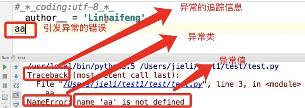 异常就是程序运行时发生错误的信号(在程序出现错误时,则会产生一个异常,若程序没有处理它,则会抛出该异常,程序的运行也随之终止),在python中,错误触发的异常如下