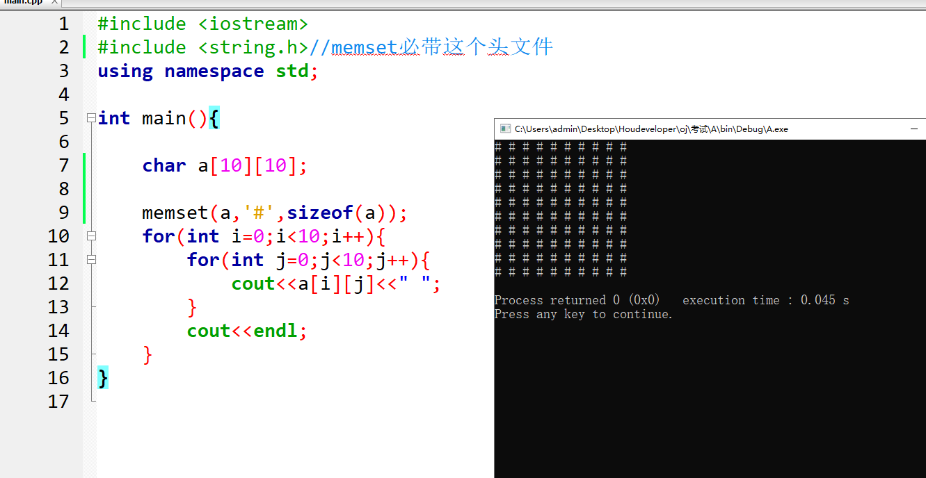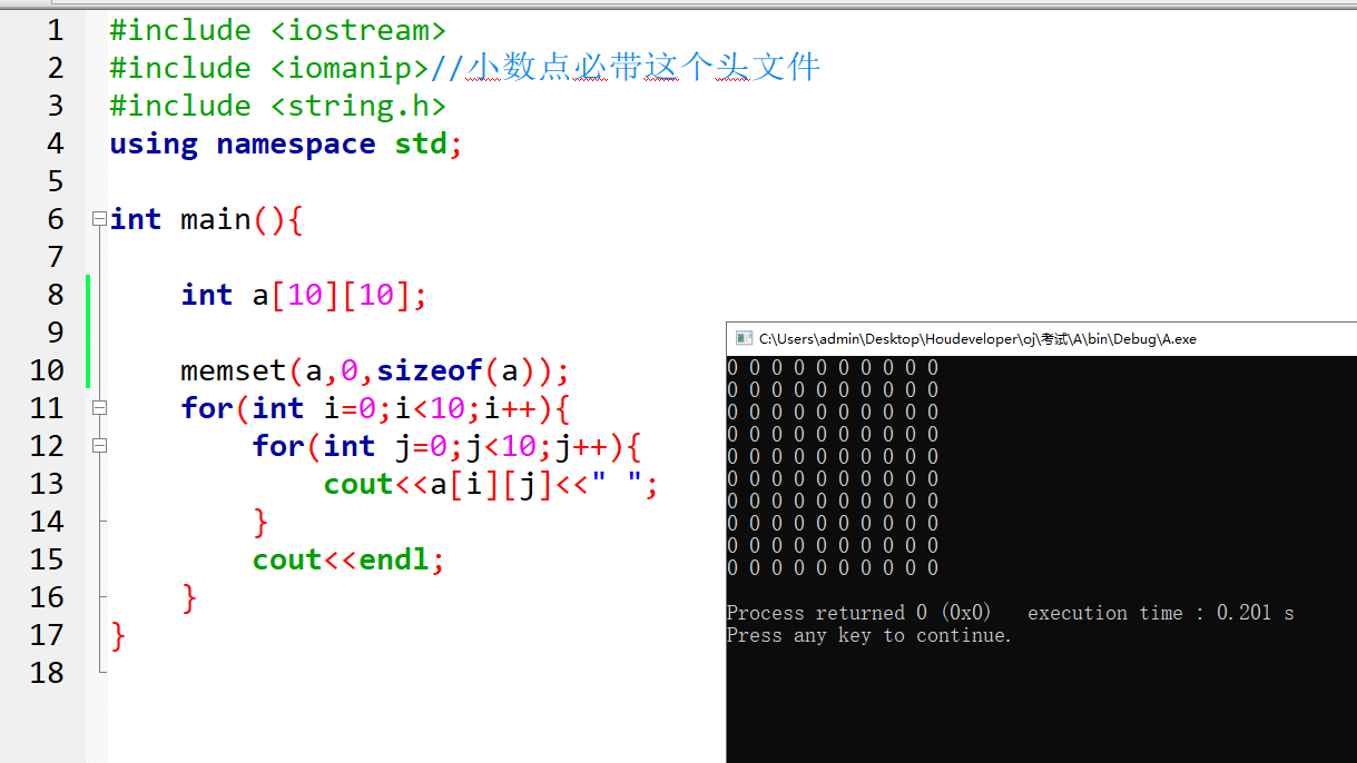 #include <iostream> #include <string.h>//memset必带这个头文件 using namespace std; int main(){ int a[10][10]; memset(a,0,sizeof(a)); for(int i=0;i<10;i++){ for(int j=0;j<10;j++){ cout<<a[i][j]<<" "; } cout<<endl; } }