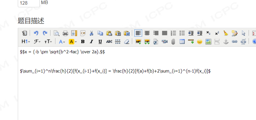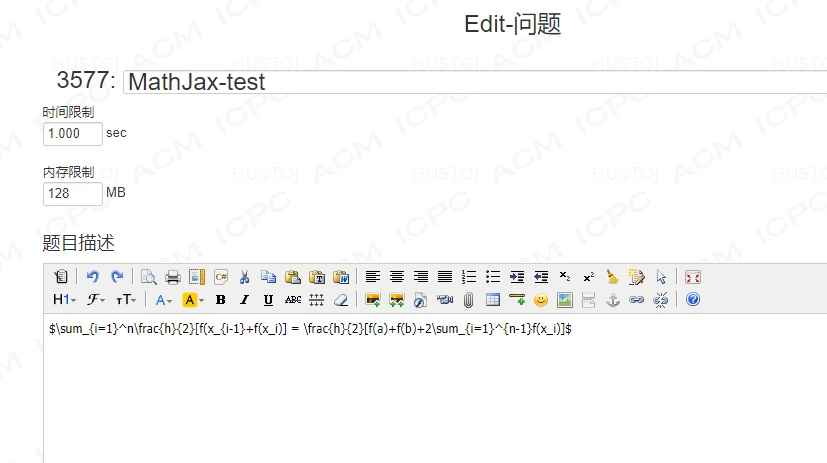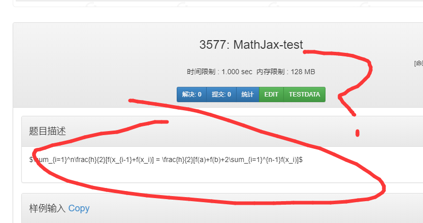1 <!DOCTYPE html> 2 <html> 3 <head> 4 <title>MathJax TeX Test Page</title> 5 <script type="text/x-mathjax-config"> 6 MathJax.Hub.Config({tex2jax: {inlineMath: [['$','$'], ['\\(','\\)']]}}); 7 </script> 8 <script type="text/javascript" 9 src="http://cdn.mathjax.org/mathjax/latest/MathJax.js?config=TeX-AMS-MML_HTMLorMML"> 10 </script> 11 12 </head> 13 <body> 14 15 $\sum_{i=1}^n\frac{h}{2}[f(x_{i-1}+f(x_i)] = \frac{h}{2}[f(a)+f(b)+2\sum_{i=1}^{n-1}f(x_i)]$ 16 </body> 17 </html>