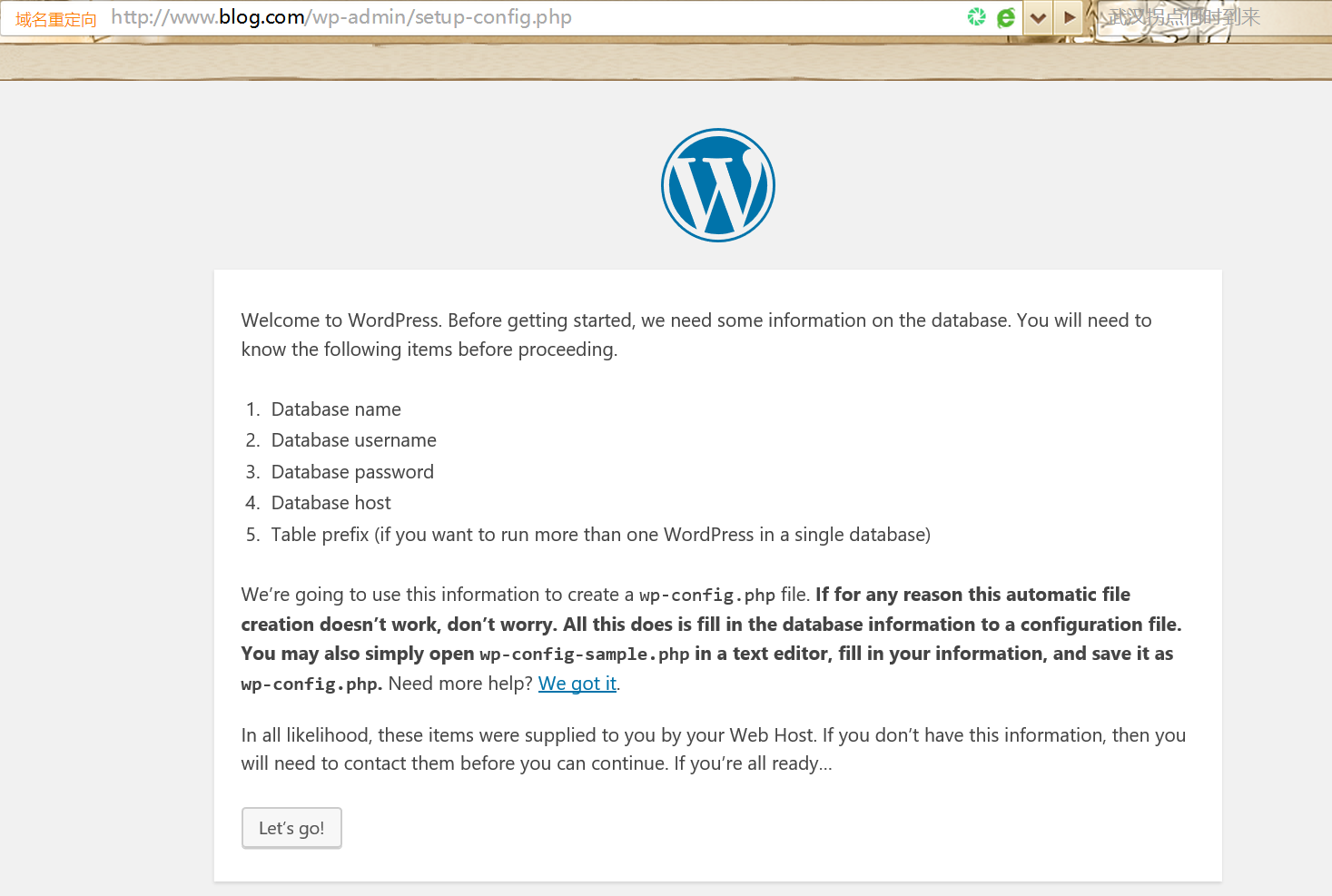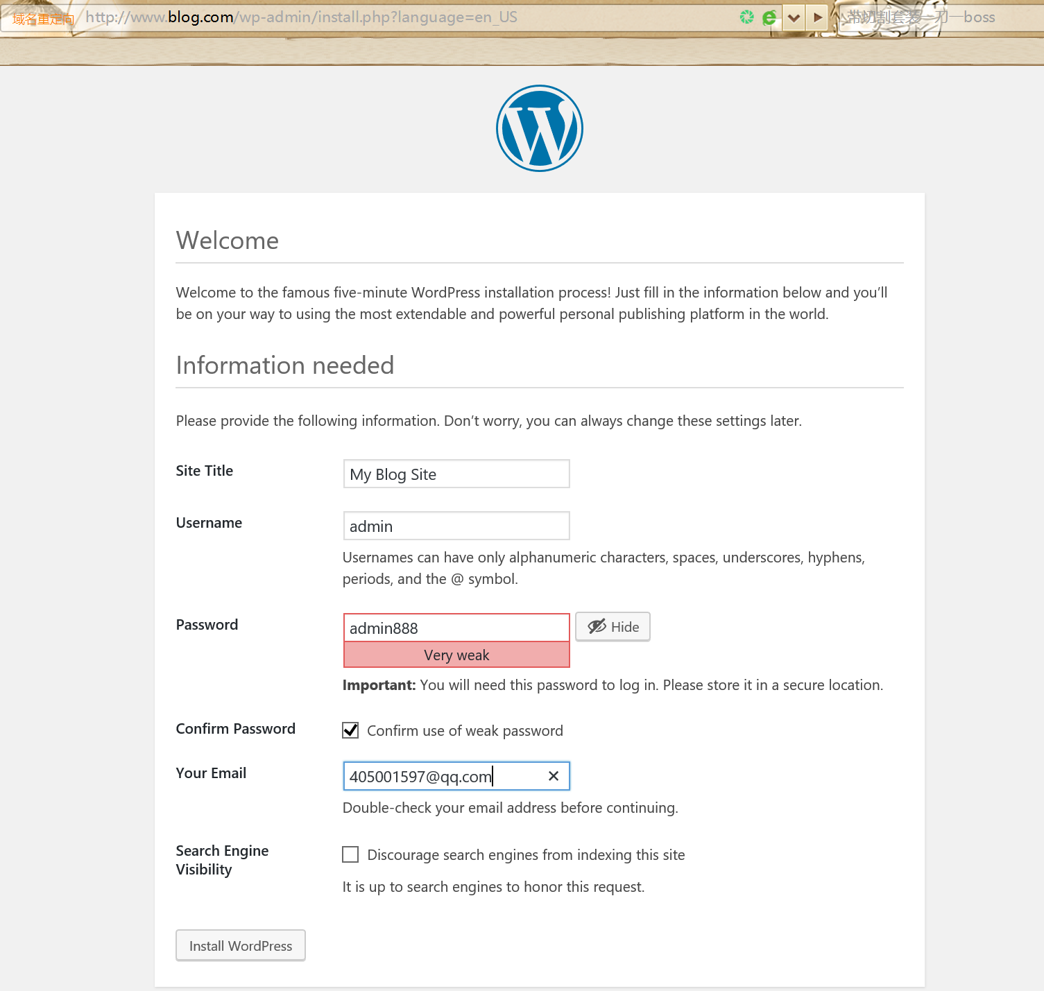 (7) 安装网站即可,利用浏览器安装,输出相应域名,根据安装向导安装即可