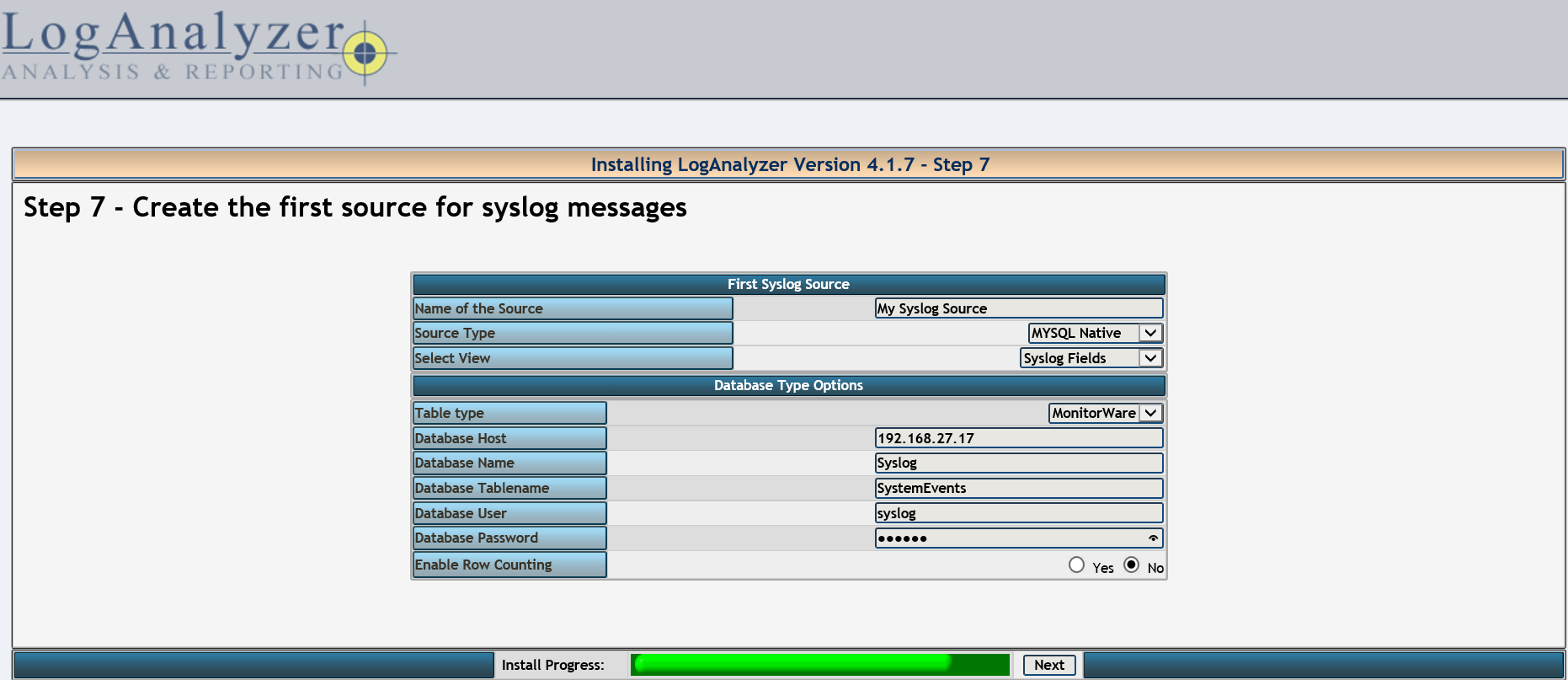 (9) 配置loganalyzer,先重启相关服务,然后用浏览器进行安装配置,在浏览器输入 http://192.168.27.17/logs 开始安装配置
