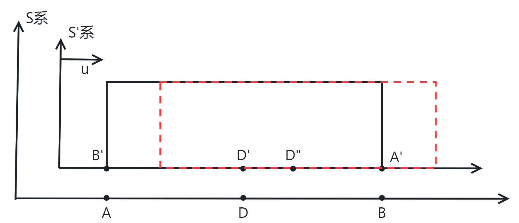 一直尺(\(S'系\))相对地面(\(S系\))以速度\(u\)向右运动,尺的左端\(A'\)发出闪光,经尺的右端\(B'\)反射,回到\(A'\)
