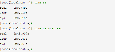 用time 命令分别获取通过netstat和ss命令获取程序和概要占用资源所使用的时间。在服务器连接数比较多的时候,netstat的效率完全没法和ss比。