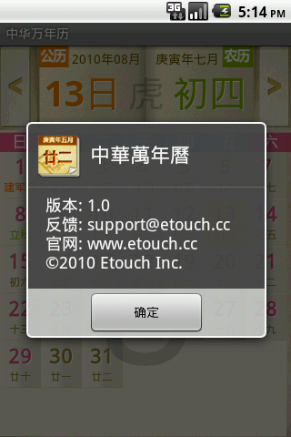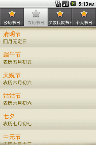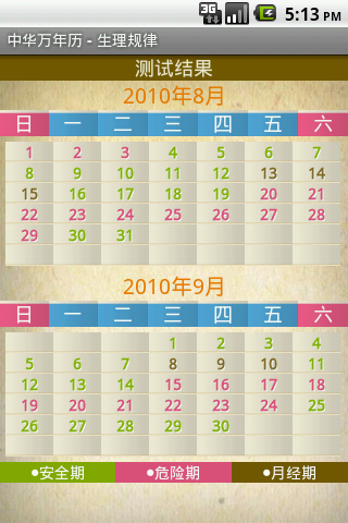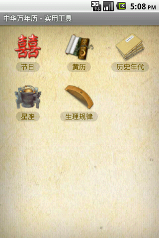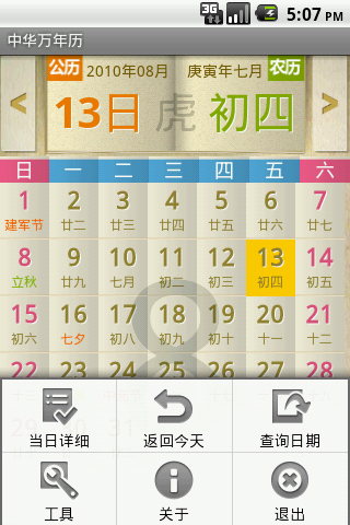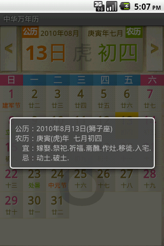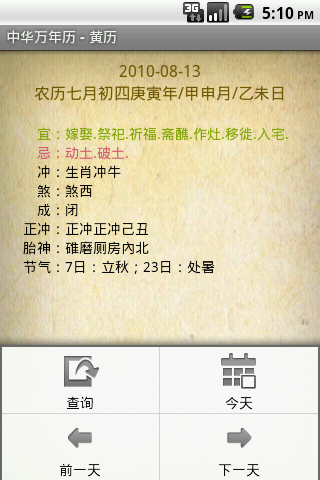 功能介绍:最基本的当然是日期及农历信息,支持日期查询、黄历信息,工具中附加节日信息、自定义节日(可在主界面中显示)、黄历查询、历史年代信息、星座和女性安全期查询。