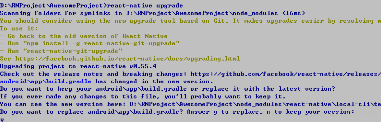 2、react-native upgrade,一路 y,最后提示 Successfully upgraded this project to react-native v0.55.4;
