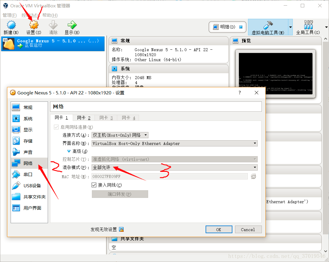 打开VM VirtualBox,设置->网络->混杂模式