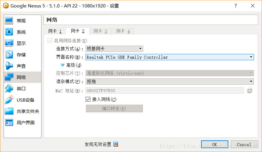 当电脑使用网线,将网关二设置成桥接网卡,模拟器可以上网;如果电脑使用WiFi,需要将网关二改成NAT!!