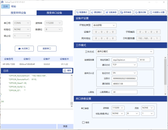 1、通过配套配置软件或web配置方式,将串口服务器ERS-T200的工作模式设置为TCP Client模式,及配置服务器IP地址等信息完成参数配置;