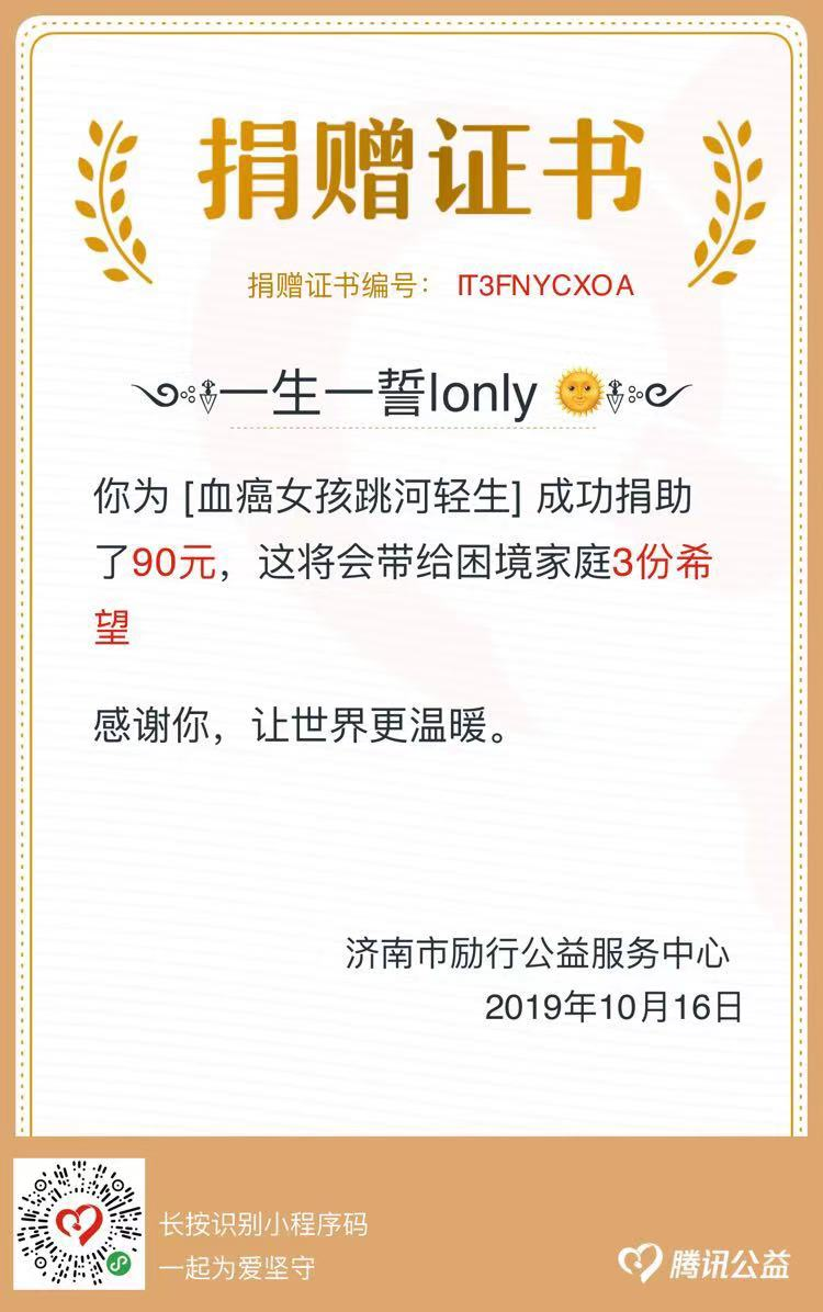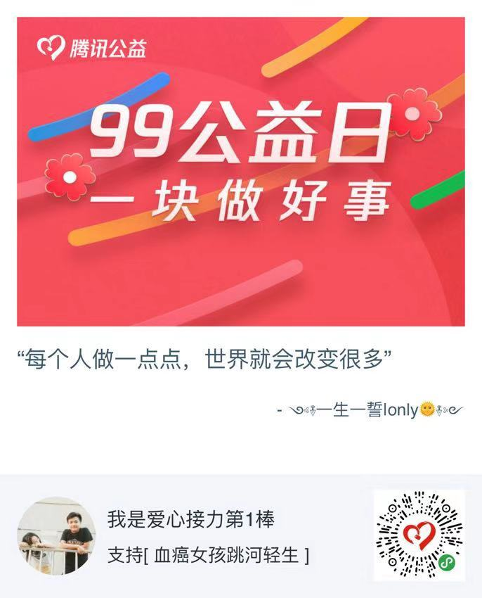 血癌需换骨髓,现已匹配到合适的骨髓,可是高昂的医疗费却让本就破烂不堪的家庭承受不起。大家与我一起来做公益吧,小溪必能汇成江流,无数的星火必能燎原。想捐助的朋友可以在微信中“我-支付-腾讯公益”中搜索“血癌女孩跳河轻生”进行捐助,也可扫码打开腾讯公益小程序,和我组队一起捐
