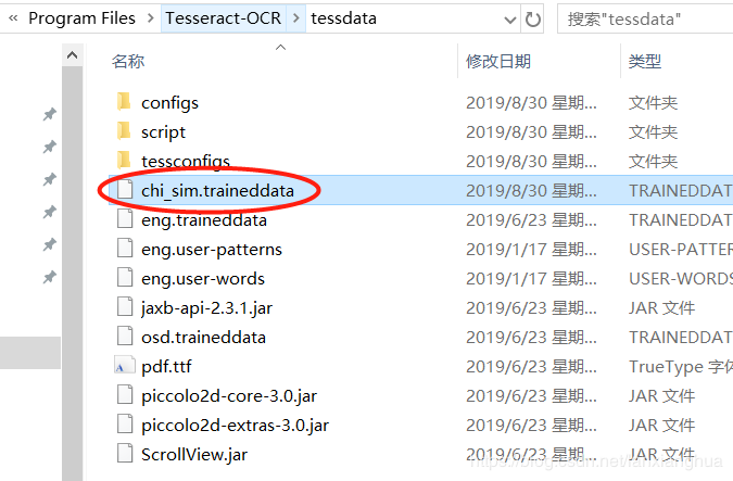 从这个链接下载:https://github.com/tesseract-ocr/tessdata,下载红圈的简体中文包。然后将此文件放置window的安装目录下。如下两个图。