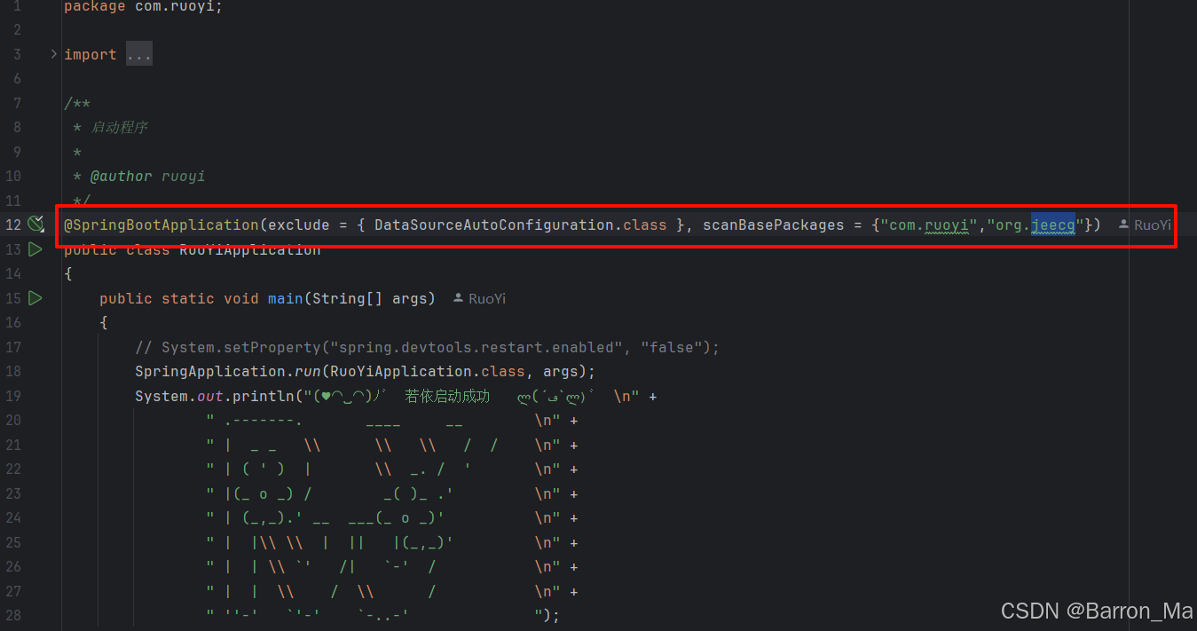 @SpringBootApplication(exclude = { DataSourceAutoConfiguration.class },scanBasePackages = {"org.jeecg","com.ruoyi"})