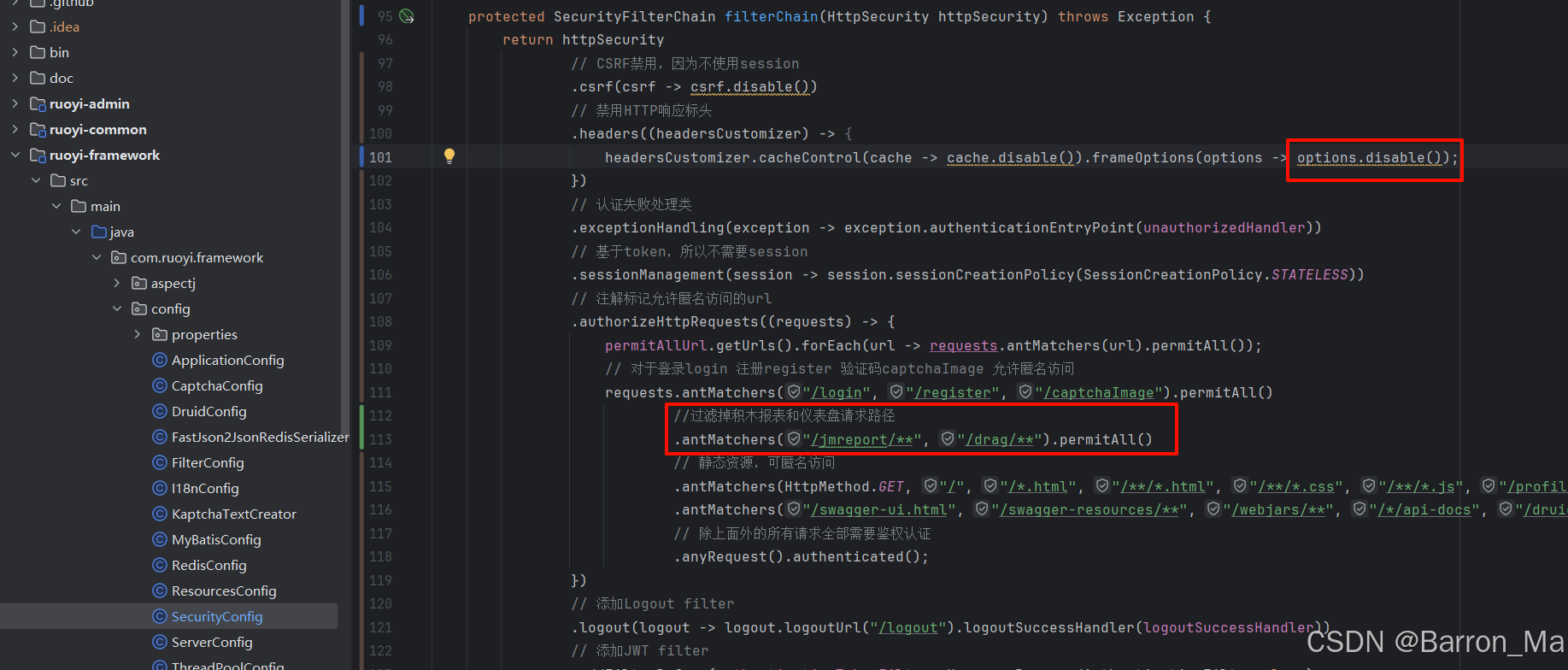 在ruoyi-framework模块中,打开SecurityConfig文件