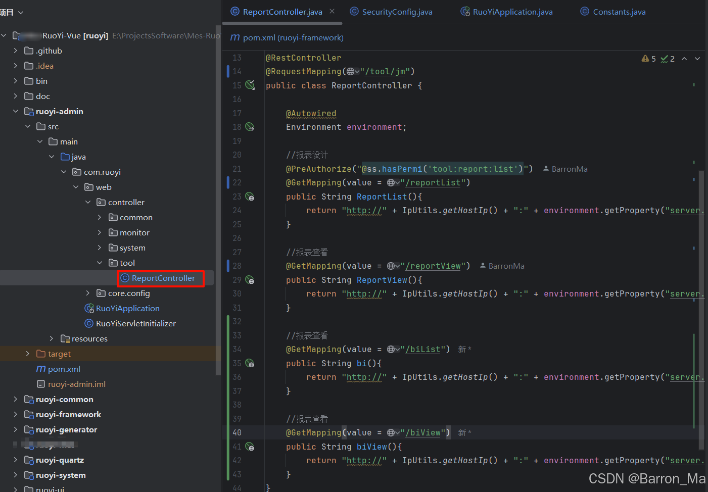 在ruoyi-admin模块中,创建src/main/java/com/ruoyi/web/controller/tool/reportController.java文件。这个controller目的向前端返回积木的前半部分地址,在前端拼接上后关部分地址。