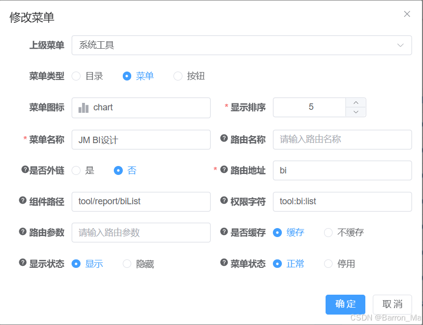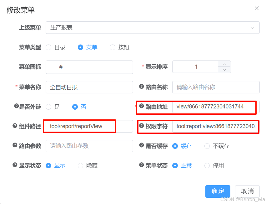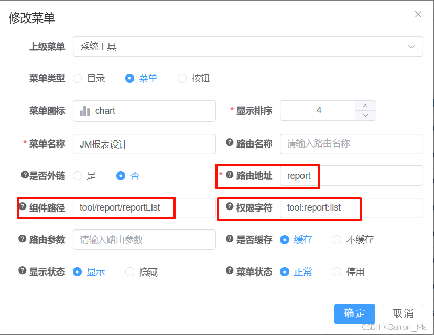 2)组件路径,填写用于显示报表的组件。可以查看第七步 创建src/views/tool/report/reportView.vue文件