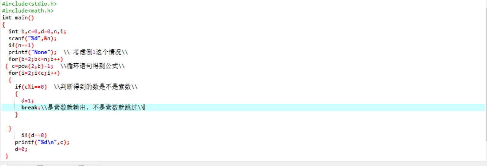 题目:梅森数,形如2n−1的素数称为梅森数(Mersenne Number)。例如22−1=3、23−1=7都是梅森数。1722年,双目失明的瑞士数学大师欧拉证明了2