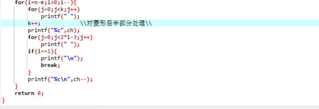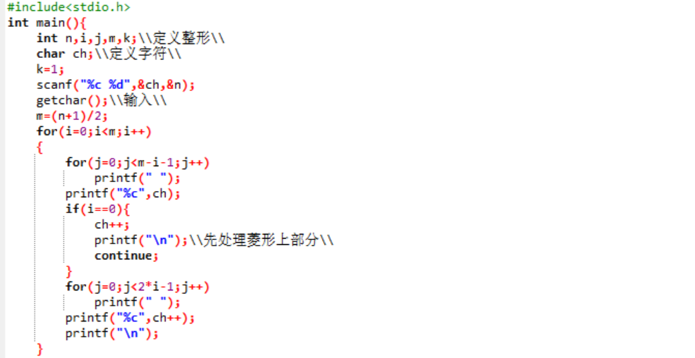 1.2题目名:编程打印空心字符菱形,本题目要求读入菱形起始字母和菱形的高度,然后输出空心字符菱形。所谓“空心菱形”是指:每行由两端为字母、中间为空格的字符串构成,每行的字符串中心对齐;上半部分相邻两行字符串长度差2,且字母从给定的起始字母逐一递增;下半部分与上半部分对称。
