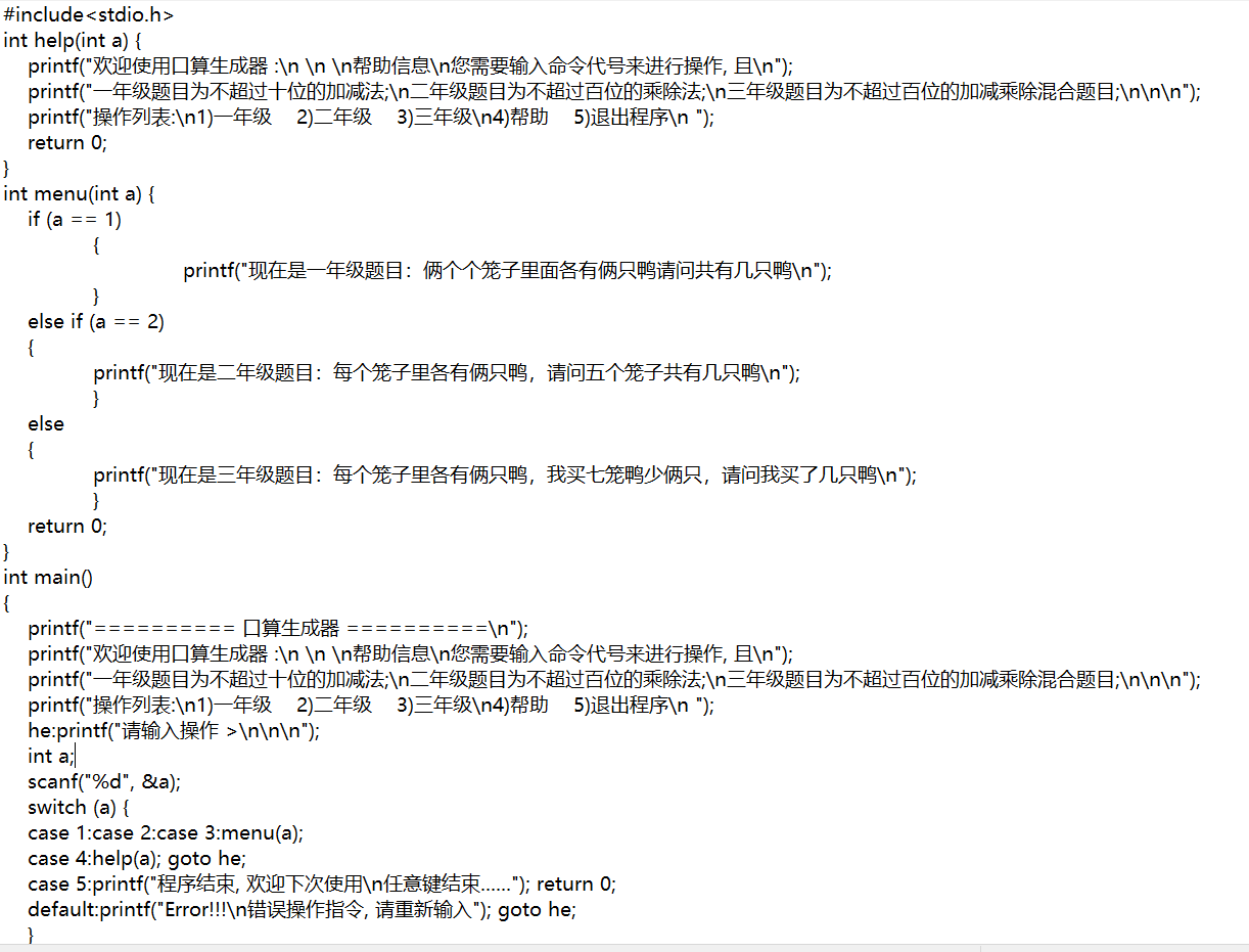 1:设计思路:题目要求三个函数一个菜单函数(里面写出内容框架),一个帮助文档(根据题目要求和菜单函数以用)还有一个主函数(用来丰富菜单,也就是写出题目),调用三个函数分工合作。