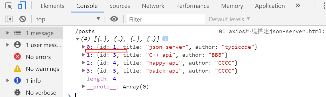 <div> <button onclick="testGet()">GET请求</button> <button onclick="testPost()">POST请求</button> <button onclick="testPut()">PUT请求</button> <button onclick="testDelete()">DELETE请求</button> </div> <script src="https://cdn.bootcdn.net/ajax/libs/axios/0.19.2/axios.js"></script> <script> function testGet() { //GET请求 axios.get('http://localhost:3000/posts').then( response => { console.log('/posts', response.data); }) } function testPost() { //POST请求 axios.post('http://localhost:3000/posts', { "id": 5, "title": "balck-api", "author": "CCCC" }).then( response => { console.log('/posts', response.data); }) } function testPut() { //PUT请求 axios.put('http://localhost:3000/posts/4', { "id": 4, "title": "happy-api", "author": "CCCC" }).then( response => { console.log('/posts', response.data); }) } function testDelete() { //DELETE请求 axios.put('http://localhost:3000/posts/2').then( response => { console.log('/posts', response.data); }) } </script>