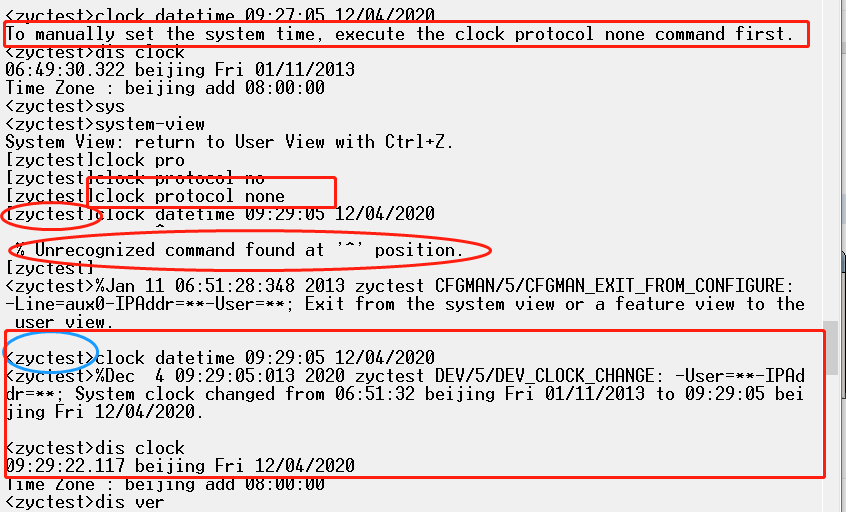 首先尝试在用户视图下修改系统时间,发现一个提示。于是按照提示到系统视图下,使用命令,