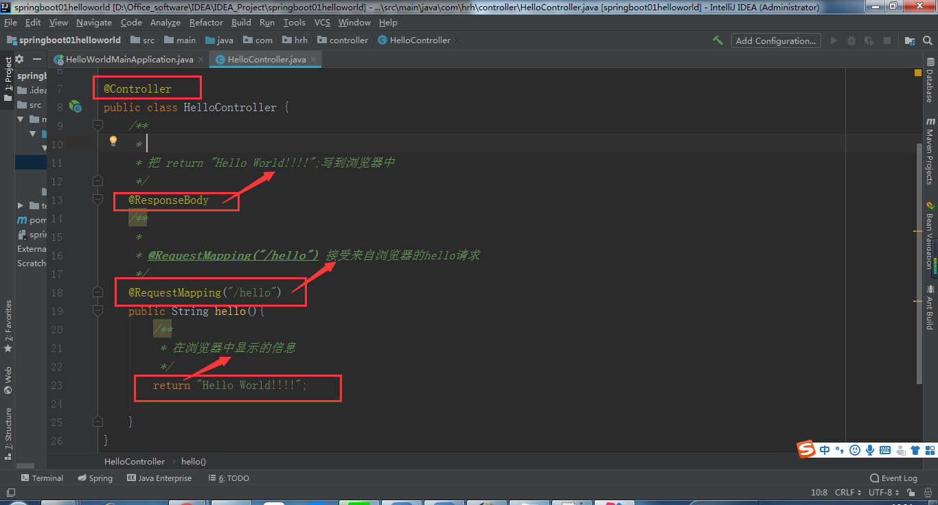 浏览器发送hello请求,服务器接受请求并处理,响应Hello World字符串;