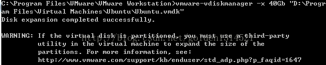 扩容命令:C:\Program Files\VMware\VMware Workstation>vmware-vdiskmanager -x 40Gb "D:\Program Files\Virtual Machines\Ubuntu\Ubuntu.vmdk"