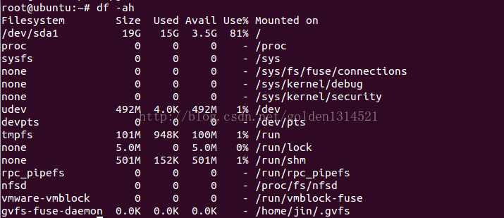 root@ubuntu:/# df -h Filesystem Size Used Avail Use% Mounted on /dev/sda1 19G 16G 2.2G 88% / udev 492M 4.0K 492M 1% /dev tmpfs 101M 968K 100M 1% /run none 5.0M 0 5.0M 0% /run/lock none 501M 152K 501M 1% /run/shm /dev/sdb1 20G 1.9G 17G 11% /storehouse