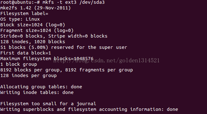 root@ubuntu:/home/now# mkfs -t ext3 /dev/sdb1 mke2fs 1.42 (29-Nov-2011) Filesystem label= OS type: Linux Block size=4096 (log=2) Fragment size=4096 (log=2) Stride=0 blocks, Stripe width=0 blocks 1310720 inodes, 5242624 blocks 262131 blocks (5.00%) reserved for the super user First data block=0 Maximum filesystem blocks=0 160 block groups 32768 blocks per group, 32768 fragments per group 8192 inodes per group Superblock backups stored on blocks: 32768, 98304, 163840, 229376, 294912, 819200, 884736, 1605632, 2654208, 4096000 Allocating group tables: done Writing inode tables: done Creating journal (32768 blocks): done Writing superblocks and filesystem accounting information: done然后挂载,成功: