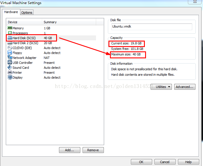 图上显示的是:眼下此虚拟硬盘的大小(current size)是19.8G,最大是(maximum size)40G。可是怎么获得这个最大磁盘容量呢?
