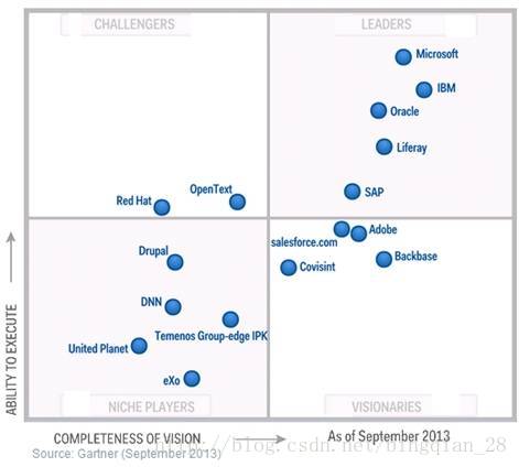 据Liferay官网报道。2013年10月。Liferay入选Gartner水平门户魔法象限中领导者象限(例如以下图所看到的)。Gartner是全球著名的信息技术研究和咨询公司。其水平门户魔法象限是对各种门户基于完整性愿景与运行能力进行的评估。从图中不难看出,Liferay Portal与微软、IBM、Oracle和SAP等全球著名软件公司的门户处于同一象限中,因此,Liferay的技术率先水平不容质疑。