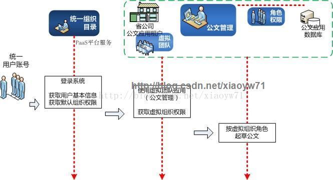 例如以下图所看到的。用户通过统一组织文件夹登录系统,获取用户基本信息和权限(应用菜单入口)。通过菜单进入开通的应用,这时,能够获取此应用下的角色权限(用于处理虚拟组织),按虚拟组织角色起草公文。