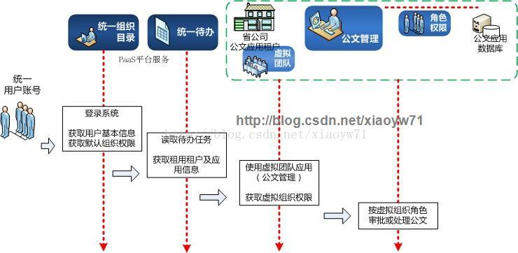 例如以下图所看到的,用户通过统一组织文件夹登录系统,获取用户基本信息和权限(应用菜单入口)。通过统一待办读取待办任务。在待办任务中包括租用应用信息。由此直接定位到详细应用功能点,进入开通的应用时,能够获取此应用下的角色权限(用于处理虚拟组织),按虚拟组织角色审批公文。