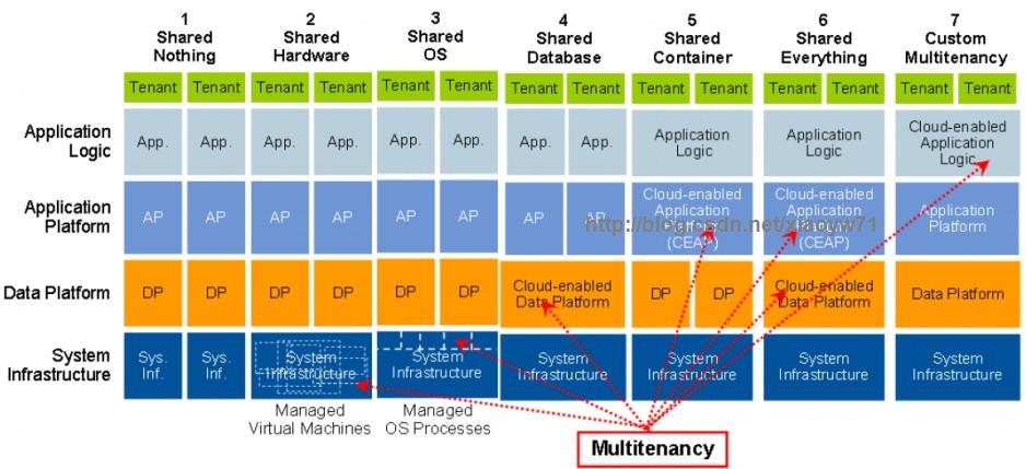 第六种模型称为“Shared Everything”,即全共享。在这样的模型中,全部租户自顶向下共享全部资源。对于提供服务的一方来讲,能够最大限度的利用各种资源,而且依托支持多租户的应用容器,也能够仅仅开发一套程序。部署一次。便可满足全部租户对公共应用的须要。