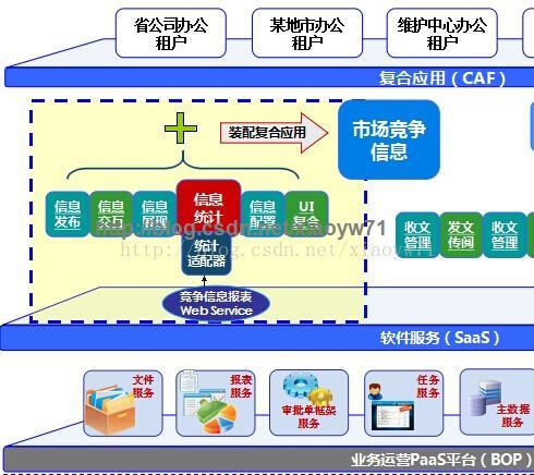 例如以下图所看到的,通过软件组件(信息公布、信息交互、信息展现、信息统计、UI复合)组装市场竞争信息应用。组装后的市场竞争信息应用提供给市场经营部门租户使用。这种方案,最好使用SaaS2.0模式,先从架构功能说说。