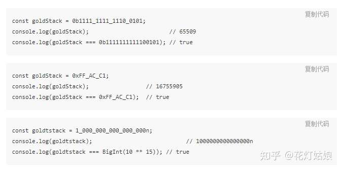 我们通过在数字相符的组之间放置分隔符使数字值更加的可读,分隔符适用于十进制表示法的数字以及二进制或十六进制表示法的数字,以及ES2020中引入的BigInts。