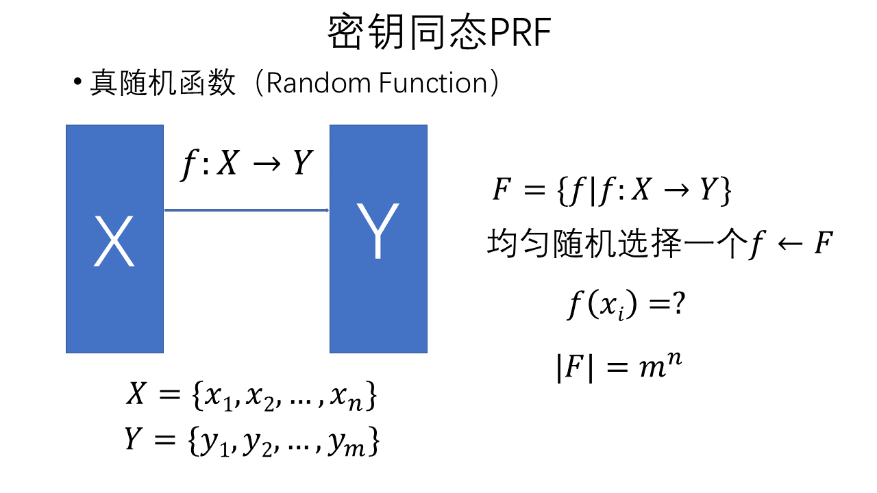 简要描述一下RF:对于一个函数F,其本质是一个映射,将一个输入集合X\(\rightarrow\)输出集合Y有很多种方式(其总数为\(m^n\),假设\(|X|=m,|Y|=n\)),所谓Random是指从𝐹={𝑓|𝑓:𝑋→𝑌}均匀随机的选取一个\(f\),对于一个特定的输入\(x_i\in X\)得到\(f(x_i)=y\in Y\)。