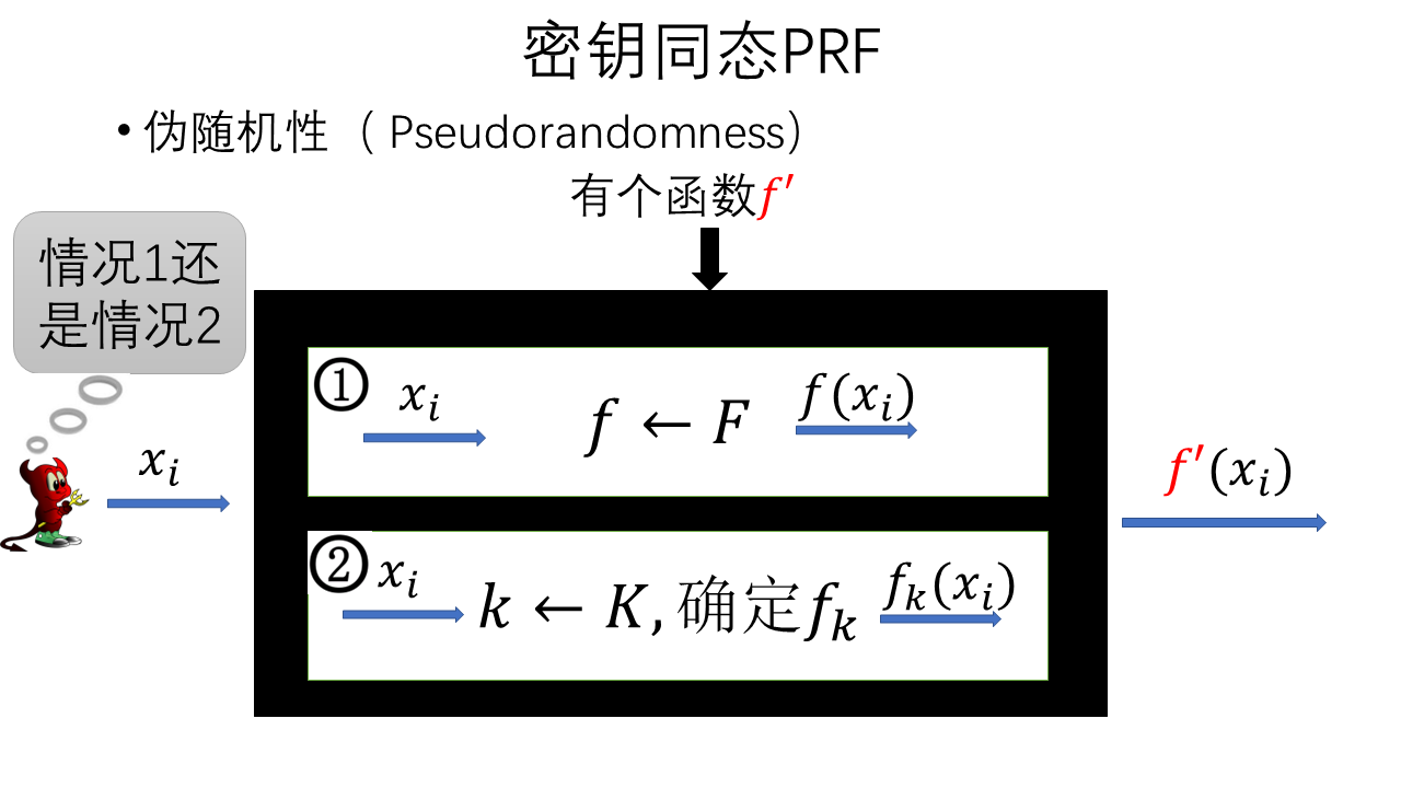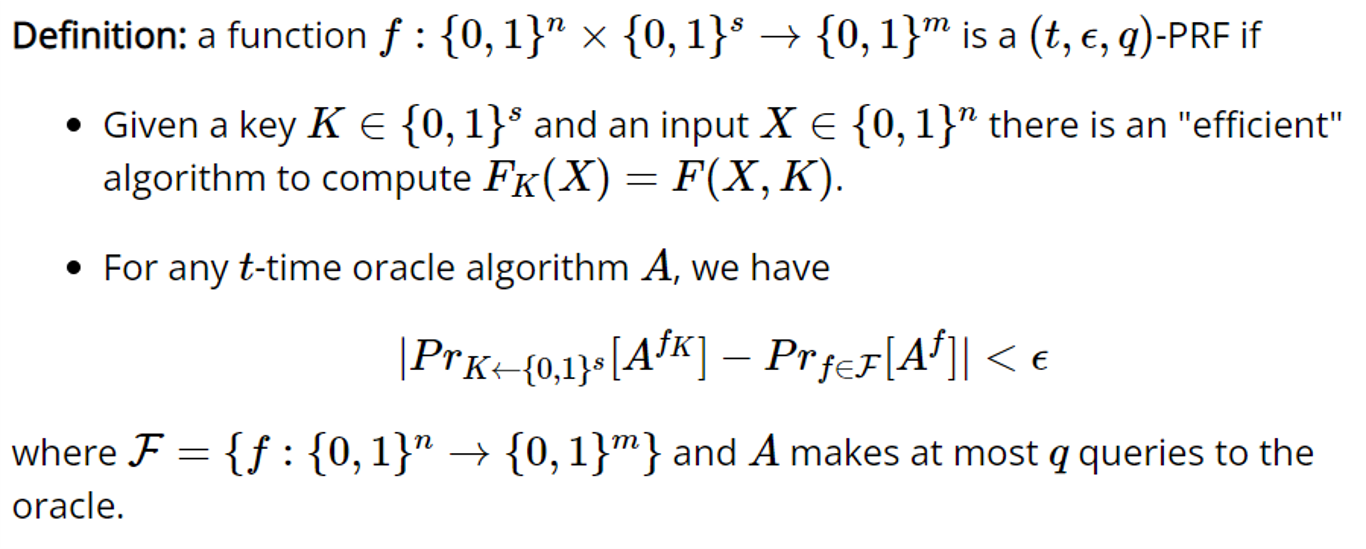 PRF是指现在有一个密钥\(k\)去选择F集合中的第\(k\)个\(f\),并不是均匀随机选取的,为了保证为随机性还需准备另一个\(f'\)是均匀随机选取的\(f\).当P1拥有密钥\(k\),P2拥有输入\(x_i\),双方执行PRF协议时P2无法区分PRF的输出\(f(x_i)\)是由P1通过自己的密钥\(k\)选取的\(f_k\)计算得到的\(f_k(x_i)\)还是由\(f'\)计算得到的\(f'(x_i)\)