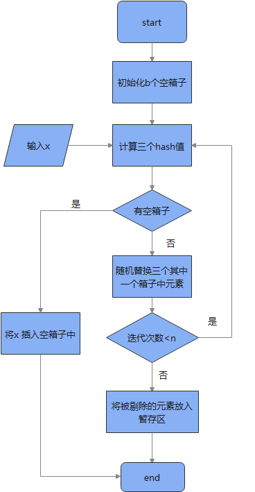 布谷鸟哈希(Cuckoo Hasing)是Pagh 和 Rodler在2004年提出的,Cuckoo Hash是一种散列方法并不是密码学中的Hash函数,但其使用的散列值是由密码学Hash函数求得的。Cuckoo将一个含有n个元素的集合X放置在一个比n大的可容纳b个元素的固定大小的空箱子\(B\)中以及一个大小不定的暂存区中。其基本思想是:针对每一个\(x_i\in X\),计算三个hash值\(h_1(x_i),h_2(x_i),h_3(x_i)\),如果\(B[h_1(x_i)],B[h_2(x_i)],B[h_3(x_i)]\)有一个空位置,就将\(x_i\)放置在该空位置上,若三个位置都不空则随机剔除一个位置上的元素,将\(x_i\)放置在该位置上,然后迭代插入被剔除的元素,若迭代一定次数后仍然没有将这个被剔除的元素放置在箱子中则将其放在缓冲区中,这也是Cuckoo的由来。