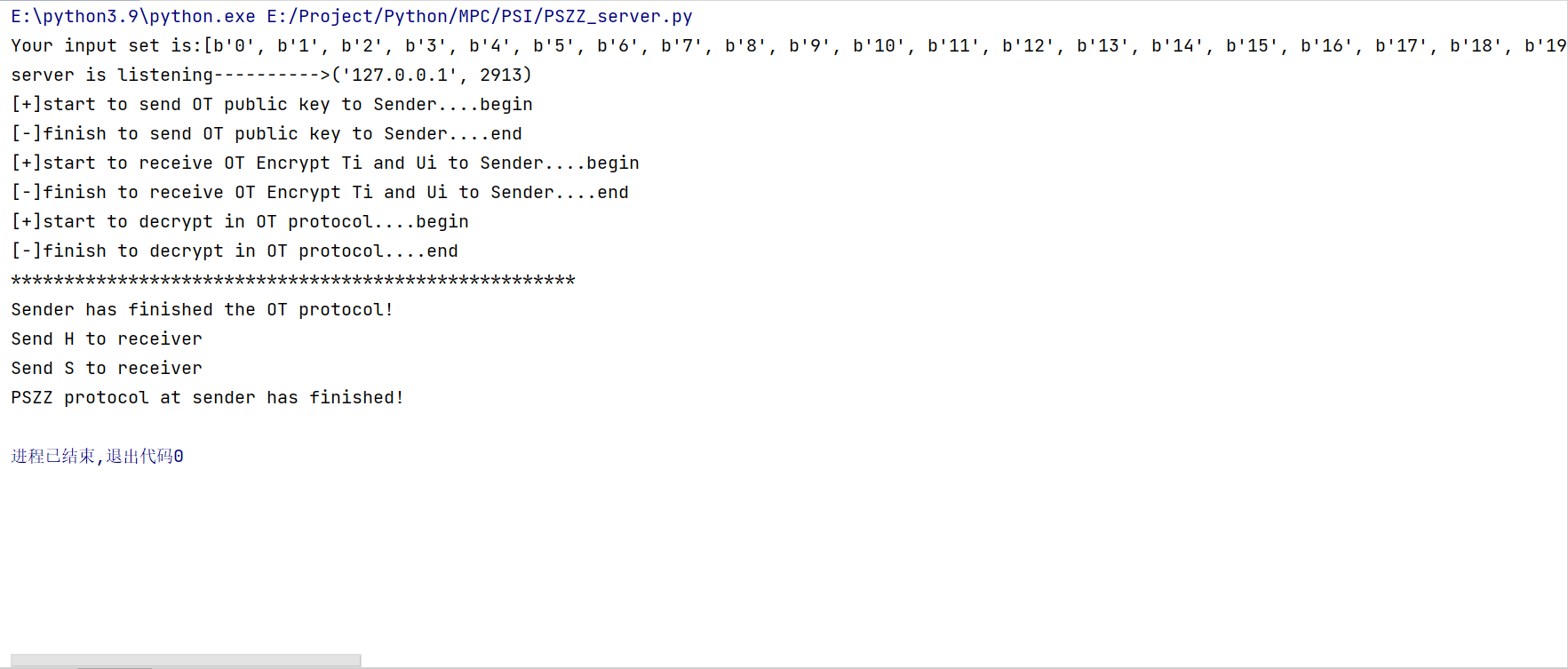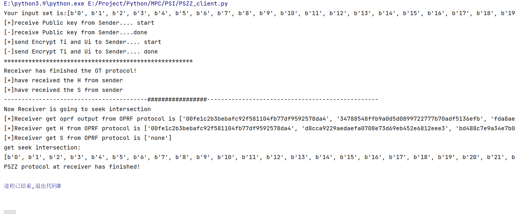 - 实现语言为python, 使用的通信协议为Socket,两个输入集合的大小为90,基础OT协议调用数量为128,伪随机编码采用的hash函数为sha1