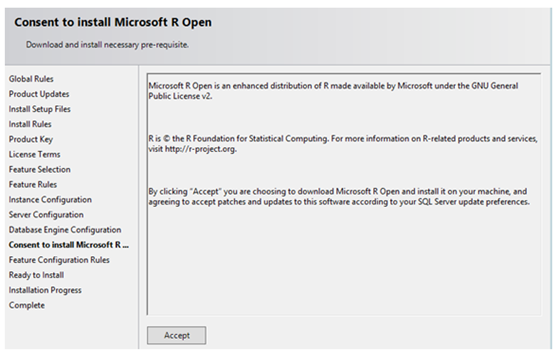 在安装之前 (在数据库或服务器版本的两种情况下), 要求您同意安装 R 打开, 这是所有版本的基本分发。