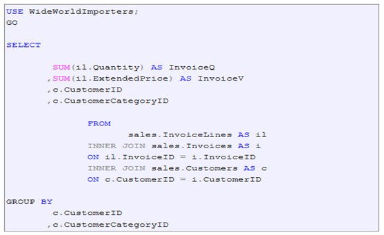 此查询正在返回 WideWorldImporters 数据库中每个客户的发票的价值和数量。 为了找到更多的客户洞察力, 我们想看看每个客户的客户类别和发票值之间的相关性。为此, 我们将使用附带的 r 脚本将数据从 SQL server 数据库推送到 R 服务器。