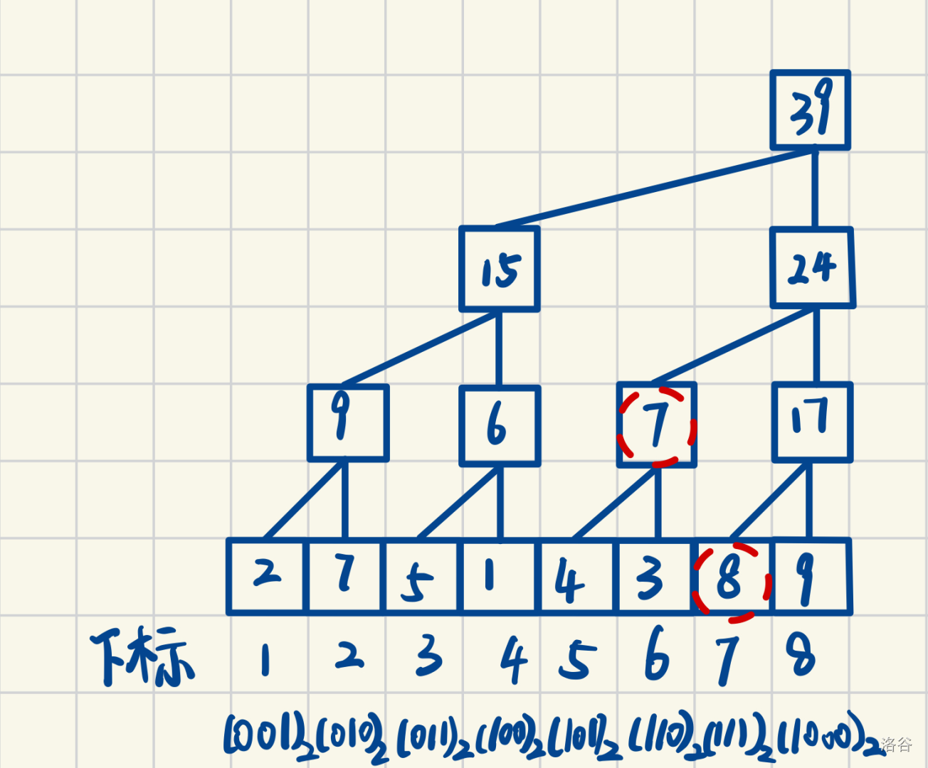 当我们要查找前 \(7\) 个数的和时,需要先查 \(7\) 自己,再查前 \(6\) 个数的数字和。