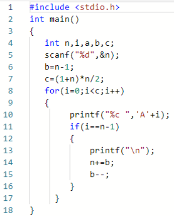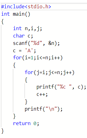 printf("%c ", c);//输出由大写字母A开始构成的三角形字符阵列