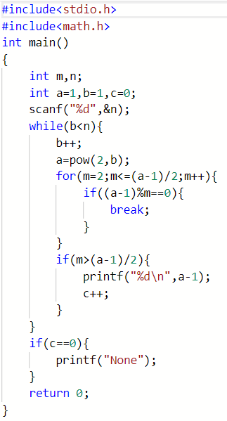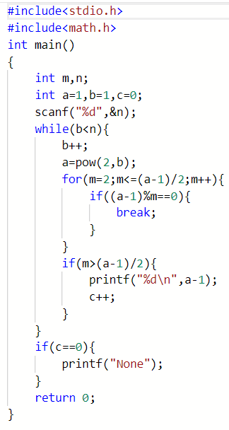 −1的梅森数,每行一个。如果完全没有,则输出“None”