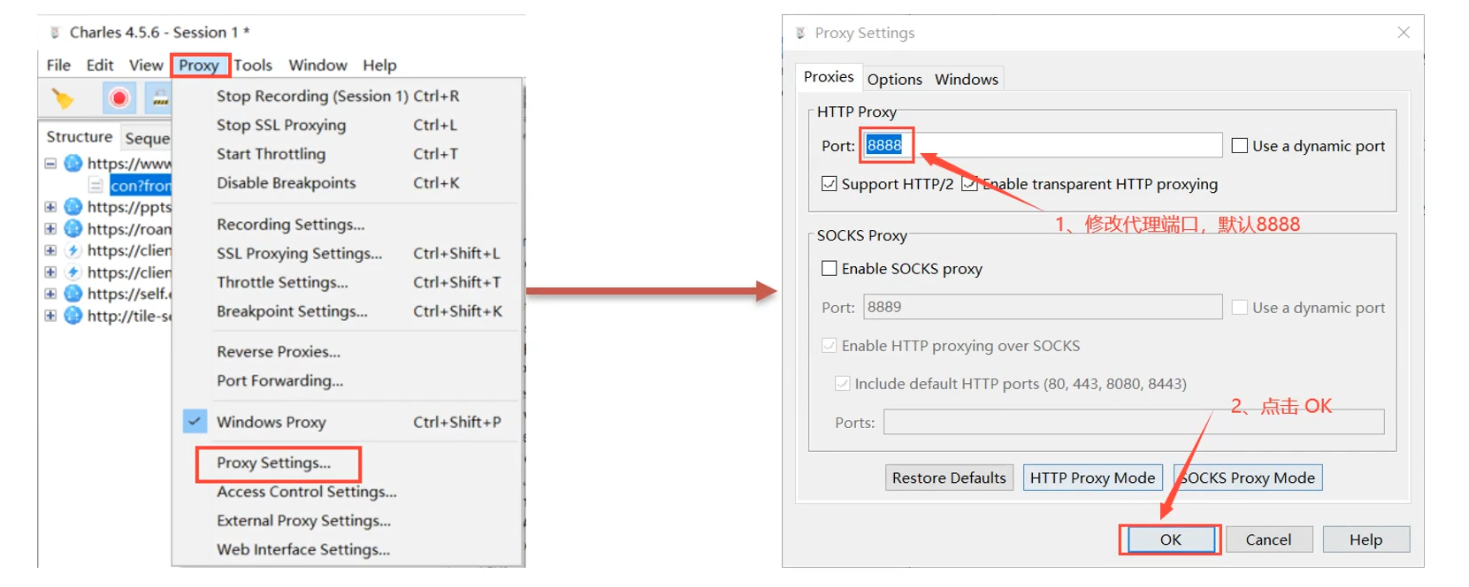 a、Charles设置代理端口: