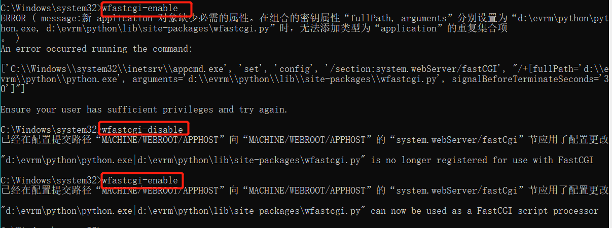 wfastcgi-enable ERROR ( message:新 application 对象缺少必需的属性。在组合的密钥属性“fullPath, arguments”分别设置为“d:\evrm\python\python.exe, d:\evrm\python\lib\site-packages\wfastcgi.py”时,无法添加类型为“application”的重复集合项 。 )