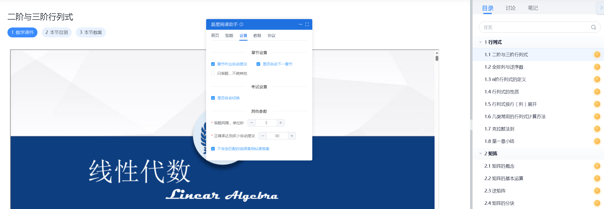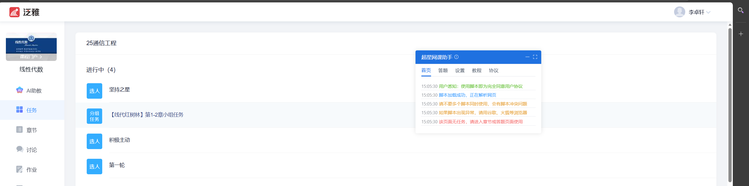 如果你知道上述方法,成功安装了插件,那么此时你登录你的网页版学习通,进入某一个课程的章节页面,此刻应该就会有一个弹窗跳出: